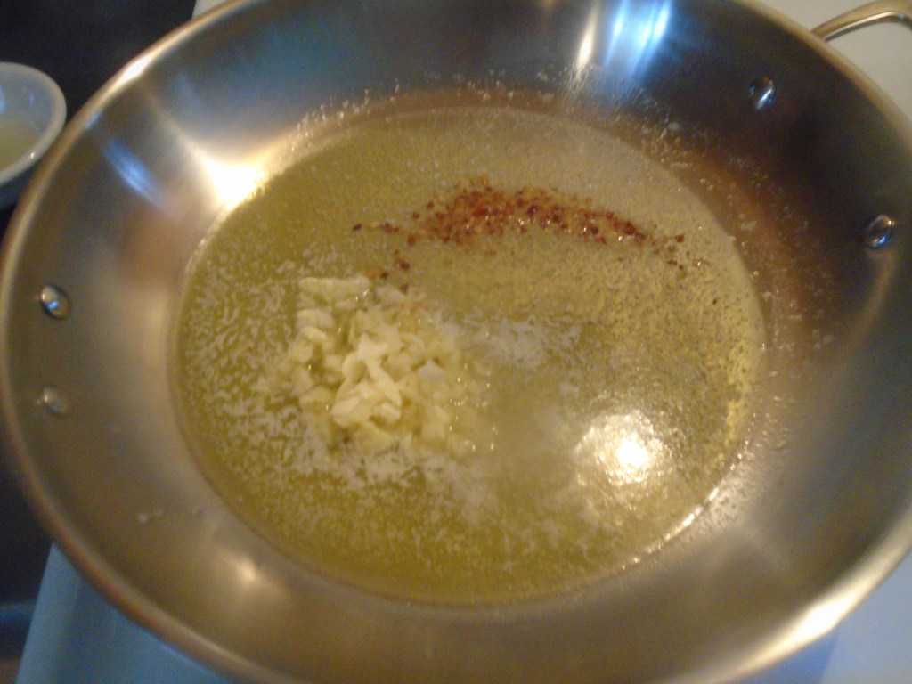 Heat the olive oil and garlic in a pan over low heat. Simmer and stir for a few minutes until the garlic softens.